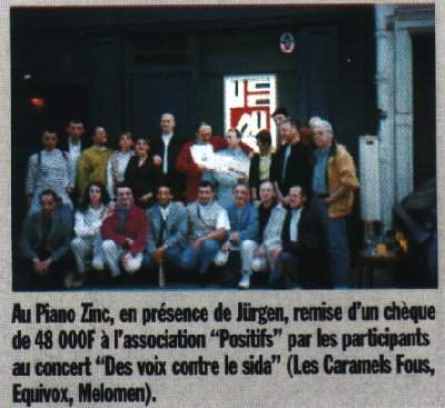 Au Piano Zinc, en prsence de Jrgen, remise d’un chque de 48000F l’association POSITIFS par les participants au concert « Des voix contre le sida » (Les Caramels Fous, Equivox, Melomen).