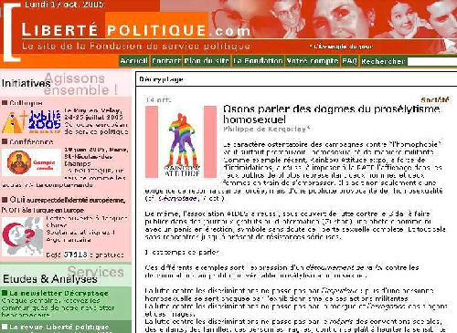 Le site Internet de la fondation de Service politique qui se présente comme un « centre de recherche et de communication (…), laboratoire d’idées, né du besoin d’éclairer les grands débats contemporains à la lumière de l’enseignement de l’Eglise », publie le texte du Père Kergorlay. Comme d’autres en politique, à l’extrême droite de l’échiquier, le prêtre se pose en victime de « communautés homosexuelles » qui disposent de « relais médiatiques et financiers » ce qui aurait pour effet d’empêcher toute critique juste et raisonnée bien sûr. Evidement, par son écrit, le Père Kergorlay vient réveiller les consciences manipulées par ces « communautés homosexuelles », auteurs, sans doute, d’un complot homo maçonnique qui ne vise qu’à saper les fondements de la religion et de la société SIC