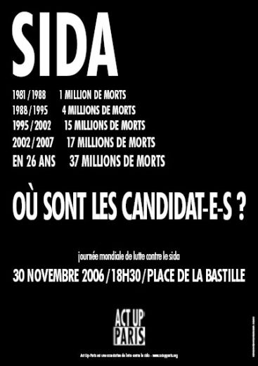 Comme chaque année, Act Up organise une grande manifestation à Paris dès ce soir, 30 novembre à 18h30, Place de la Bastille. «A cinq mois des présidentielles, cette manifestation sera bien sûr l’occasion d’interpeller les candidatEs sur le sida et de leur demander des engagements précis sur la manière dont ils et elles entendent inscrire cette lutte dans leur politique. Qu’ils et elles soient prévenuEs : nous ne rangerons pas les discours incantatoires et les démonstrations compassionnelles dans la catégorie des engagements.» annonce l’association dans un communiqué.