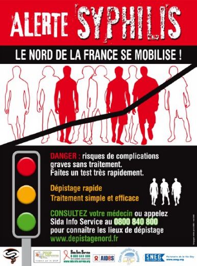Devant la recrudescence des cas et le changement progressif du profil des patients, les associations locales et nationales – AIDES, Sida-Info-Service, Spiritek et le SNEG – se mobilisent et organisent une grande campagne d’incitation au dépistage de la syphilis dans toute la région Nord-Pas-de-Calais. Cette campagne est financée par le Groupement Régional de Santé Publique (GRSP).