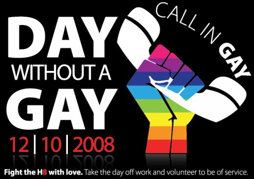 Deux gays californiens ont lancé une initiative originale qui a fait boule de neige sur la toile : une journée sans homos au travail, ne consommant pas et s’impliquant dans des oeuvres caritatives pour montrer l’apport des LGBT à la société américaine et protester contre l’adoption de la Proposition 8 bannissant le mariage gay en Californie.