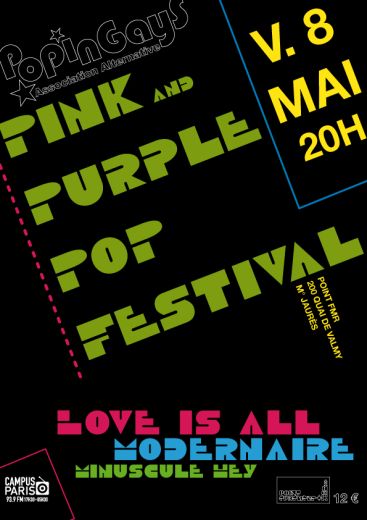 8 ème Pink and Purple Pop Festival – le 8 mai 2009 au Point Ephémère – 200 quai de Valmy – 75010 PARIS (Métro Jaurès) Ouverture des portes à 20h – Entrée : 12? sur place – Disponible en prévente dans les points de vente habituels.