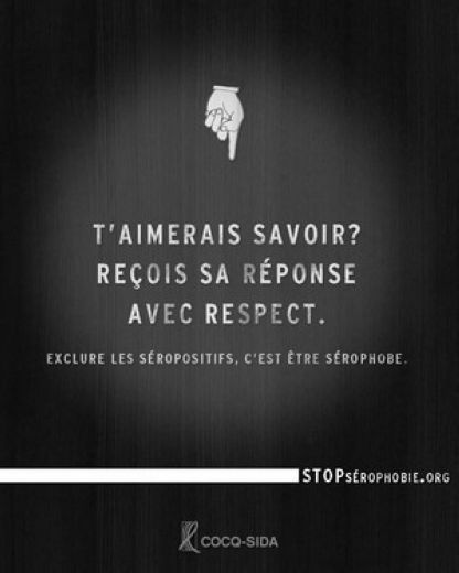 Une coalition associative québécoise vient de lancer une campagne sur un sujet peu traité de notre côté de l’atlantique et pour lequel il y aurait pourtant beaucoup à faire. En l’espèce, elles entendent s’opposer, au sein même de la communauté homosexuelle, à la sérophobie soit «une manifestation de peur et d’aversion de la part de certains individus à l’égard des personnes vivant avec le VIH. Comme l’homophobie, elle se manifeste par des actes d’exclusion ou de discrimination, implicites ou explicites».