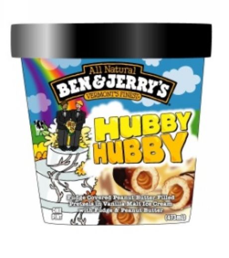 Pour marquer cet évènement et en guise de soutien, le célèbre glacier Ben and Jerry’s, basé historiquement dans le Vermont, a décidé de rebaptiser un de ses parfums, «Chubby Hubby» (Mari Grassouillet) en «Hubby Hubby» (Mari Mari), le pot étant illustré par un couple d’homme portant la redingote traditionnelle de tout mariage américain.