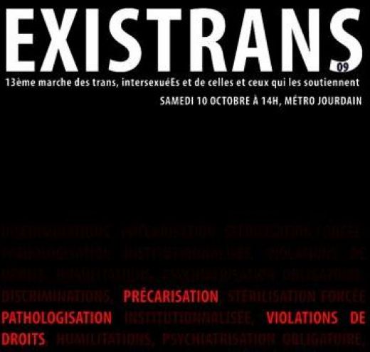 «Dans un contexte politique de réforme, les associations LGBT s’inquiètent quant à la continuité de la prise en charge et la considération des personnes Trans’ et intersexué.e.s» écrivent les associations organisatrices de l’Existrans. Elles reviennent sur l’annonce faite par Roselyne Bachelot-Narquin le 16 mai 2009 sur la «déclassification de la transsexualité des affections psychiatriques de longue durée». Si les militantEs saluent cette initiative symbolique, elles continuent à revendiquer «la dépsychiatrisation totale et effective de la transidentité à savoir l’absence du recours obligatoire au psychiatre pour démarrer une transition. Néanmoins, cela ne doit pas être synonyme d’un arrêt des remboursements pour les personnes Trans’ et intersexué.e.s».