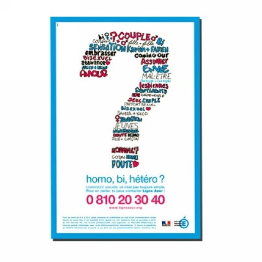 L’affiche, neutre et sans représentation physique de ce que peuvent être un ado homosexuel alors même que cette classe d’âge a besoin de s’identifier au moins visuellement, représente une série de mots dédiés, l’ensemble symbolisant un point d’interrogation. Un slogan tout aussi neutre est ajouté : «Homo, bi, hétéro ? L’orientation sexuelle n’est pas toujours simple. Pour en parler tu peux contacter Ligne Azur».