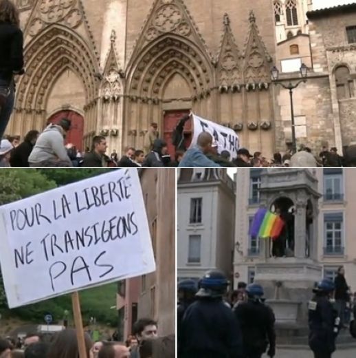 «Assez, assez, de cette société qui ne respecte pas les trans, les gouines et les PD !» ont scandé les militants LGBT auxquels répliquaient les intégristes par un détournement d’un slogan antiraciste, méthode habituelle de l’extrême droite : «Première, deuxième, troisième génération : nous sommes tous, des enfants d’hétéros». Les militants intégristes ont également entonné des prières et fait pour certains des saluts nazis. Au drapeau du Vatican brandi d’un côté par ce que «Saint-Jean est à nous» (ndr : entendre les catholiques), le drapeau Arc en ciel a été déployé de l’autre en opposant un «vade retro les fachos».