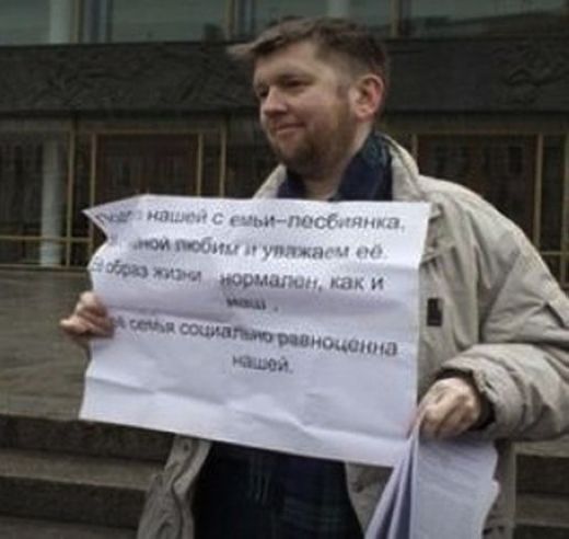 Il y a dix jours les deux hommes ont en effet été appréhendés en ville alors qu’ils brandissaient des banderolles contre la nouvelle loi et Sergey Kondrachov expliquait même ses motivations personnelles sur la sienne:  »Une amie de ma famille est lesbienne. Ma femme et moi l’aimons et la respectons. Sa famille mérite les mêmes droits que la nôtre ».
